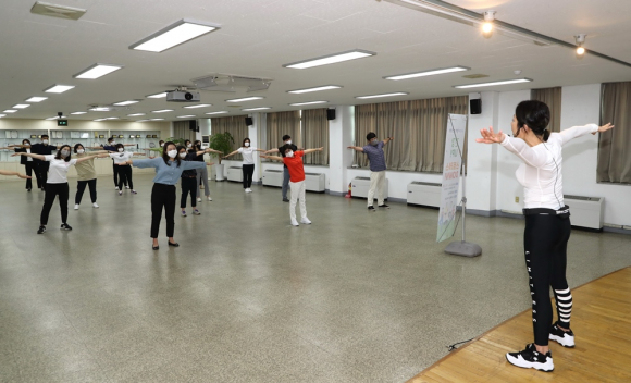 ‘건강 업! 스트레스 다운!’ 프로그램은 스트레칭·자세교정 등 직원들의 건강관리를 위해 화요일과 목요일 아침마다 시행되며, 희망하는 직원들의 신청을 받아 소규모로 진행한다.