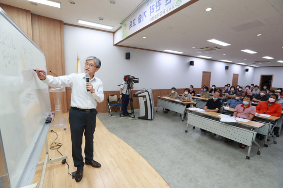 ㈜그린피아산업 김대환 대표를 강사로 초빙해 조생종 사과 착색관리 방법’에 대한 강의가 있었다. 예천군 제공