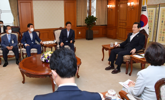 | ↑↑ 이철우 지사와 이강덕 포항시장이 정세균 국무총리를 찾아 포항 특별법 시행령에 대한 부당함을 건의했다. 경북도 제공 |