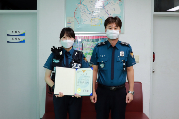 예천 호명지구대 전아영 순경(좌측)에게 표창장을 수여했다. <예천 경찰서 제공>