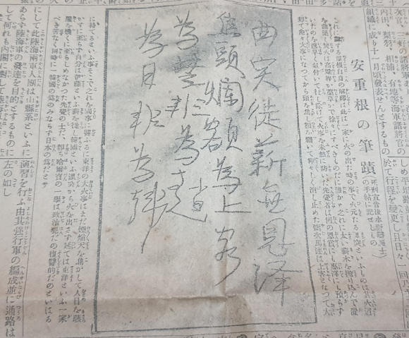 1910년 2월 22일자 일본 오사카마이니치 신문(大阪每日新聞) 7면에는 ‘안중근 의사가 일본인 변호사 미즈노 기치타로(水野吉太郞)의 수첩에 직접 적은 글’이 보도됐다.