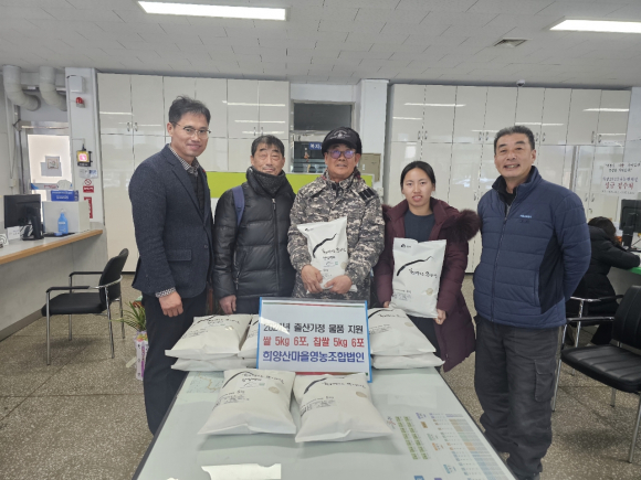 문경 가은읍 호재 희양산마을영농조합법인이 지난 9일에 가은읍 행정복지센터를 방문해 2024년도 자녀를 출산한 6가구에 가구당 쌀5kg 1포, 찹쌀 5kg 1포를 전달했다.