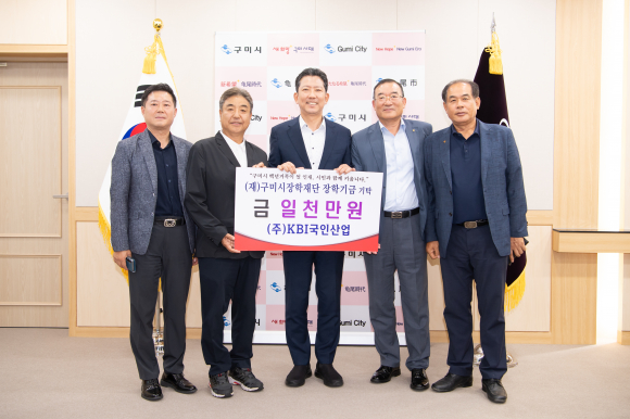 ㈜KI국인산업(대표이사 시명권)이 지난 20일 구미시장 집무실을 방문해 (재)구미시장학재단(이사장 김장호)에 지역인재육성 장학기금 1000만 원을 기탁했다.
