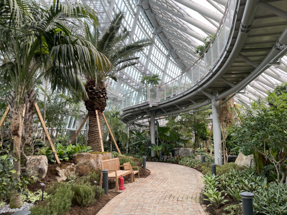 해돋이를 형상화한 유려한 곡선의 아치형 유리 온실은 길이 130m, 폭 35m, 높이 22m 규모로 설계되었으며, 첨단 온습도 조절 시스템이 적용되어 연중 일정한 기후를 유지한다. 내부는 열대·아열대 기후를 구현한 공간으로 꾸며져 있으며, 200여 종 이상의 식물이 식재 됐다.