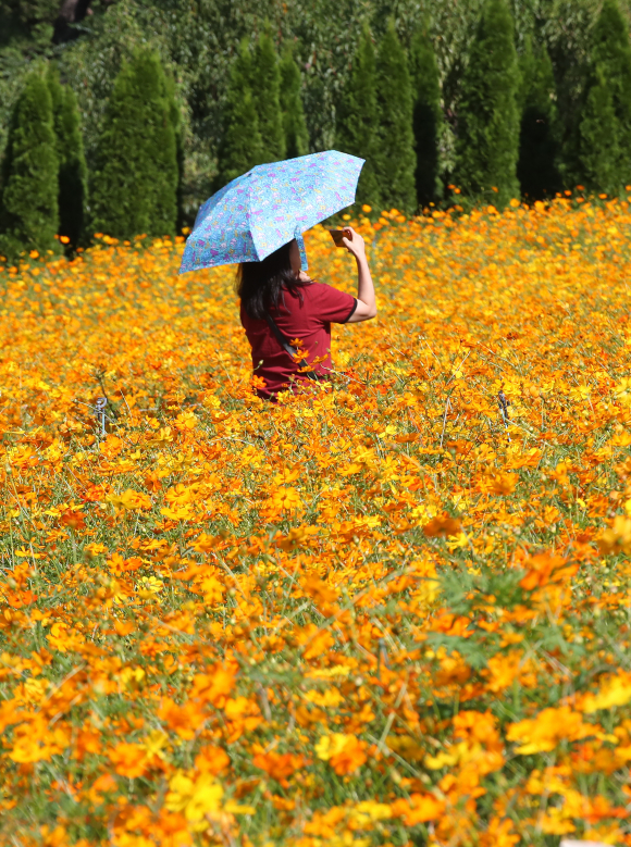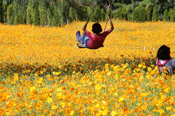 1일 대구 달서구 테마파크 이월드를 찾은 시민이 황화 코스모스가 곱게 물든 포시즌 가든에서 완연한 가을을 만끽하고 있다.뉴스1