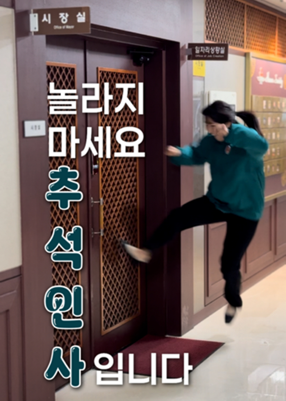| ↑↑ 경주시청 공무원이 시장실 문을 발로 차고 들어가는 장면으로, 문이 열리자 주낙영 경주시장이 등장해 “추석 인사드립니다”라고 전하며 웃음을 자아내고 있다.<경주시 제공> |