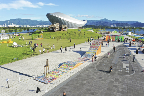 | ↑↑ '2025 달성 대구현대미술제'가 강정보 광장에서 열린 가운데 방문객들이 야외 전시를 감상하고 있다. 달성군 |
