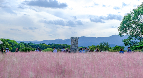 경주의 상징적 건축물인 첨성대는 가을이면 새로운 색으로 물든다. 첨성대 주변에 펼쳐진 핑크뮬리 군락지는 분홍빛 물결을 이루며, 바람에 따라 출렁이는 모습이 마치 분홍빛 안개처럼 신비로워 인생사진을 남기고 싶은 여행객들에게 큰 인기를 끌고 있다. 낮에는 파란 가을 하늘과 어우러지고, 저녁 무렵에는 노을빛과 섞여 황홀한 풍경을 선사한다. 첨성대의 고풍스러움과 핑크뮬리의 화사함이 만나면서, 천년의 역사가 낭만적인 풍경 속에 스며든다.