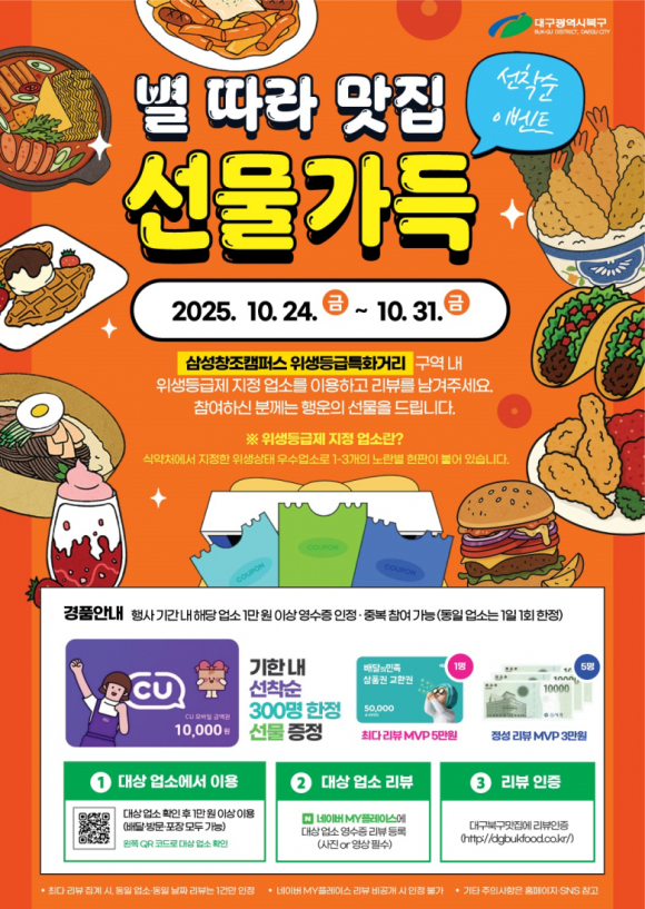 대구 북구보건소가 20~31일까지 위생등급 특화구역을 널리 알리고 지역 상권을 활성화하기 위한 ‘별 따라 맛집, 선물가득 SNS 이벤트’를 진행한다.