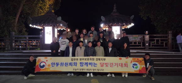 | ↑↑ 권영호 한국법무보호복지공단 경북지부장과 김은현 안동위원회장과 자원봉사자 등이 함께하는 달빛 걷기대회에서 기념촬영을 하고 있다. 한국법무보호복지공단 경북지부 제공 |