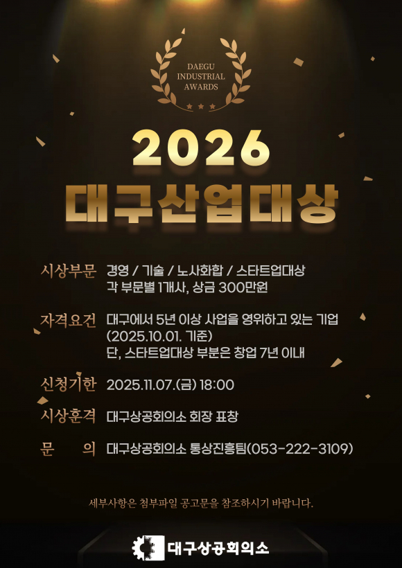 대구상공회의소(회장 박윤경)가 지역 상공업 진흥과 경제 발전에 기여한 기업을 발굴·포상하는 '2026년 대구산업대상'을 공모한다. 시상부문은 경영대상, 기술대상, 노사화합대상, 스타트업대상으로 4개 부문에서 각 1개사를 선정해 내년 1월초 '대구상공회의소 경제계 신년인사회'에서 대구상공회의소 회장 명의로 시상할 예정이다.