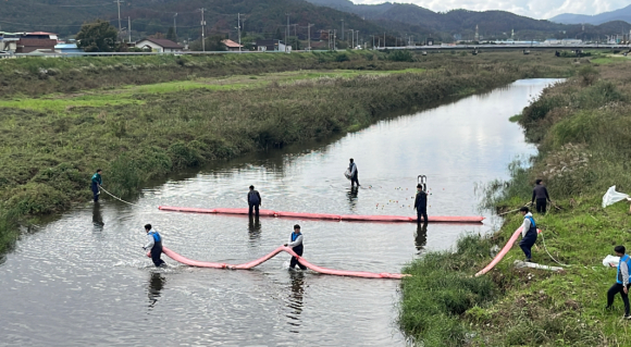 훈련은 유류 운반차량의 교통사고로 경유 약 100리터와 엔진오일이 하천에 유출된 상황을 가정해, 방제장비를 활용한 오염 확산 차단과 긴급 방제조치를 실전과 같이 진행했다.