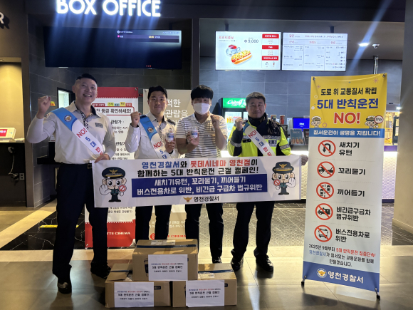 영천경찰서가 시민의 교통안전 의식 제고와 법질서 확립을 위해 롯데시네마 영천관과 협업해 ‘5대 반칙운전 근절’ 홍보 캠페인을 실시했다.