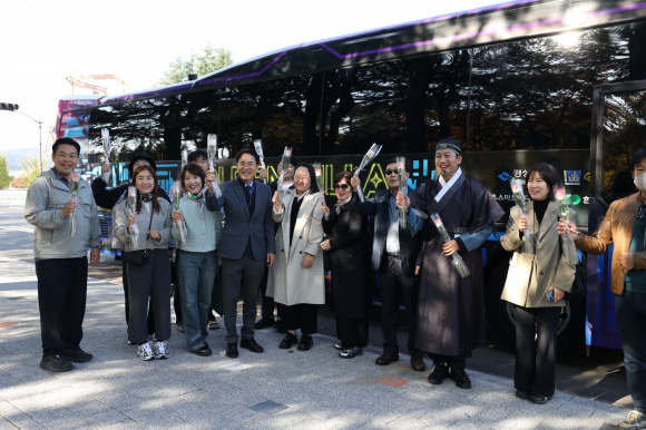 | ↑↑ 골든 신라 XR모빌리티 버스 시승식에서 시민들이 기념촬영을 하고 있다.<경주시 제공> |