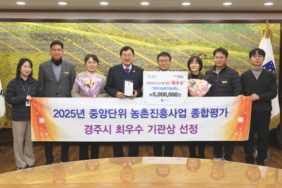 경주시가 농촌진흥사업 전반에서 우수한 성과를 인정받아 지난 4일 농촌진흥청에서 열린 '2025년 농업과학기술 성과공유대회'에서 농촌진흥사업 종합평가 ‘최우수상’을 수상했다.