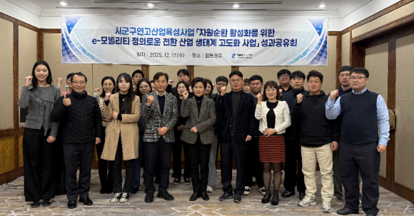 | ↑↑ 17일 힐튼호텔 경주 파인룸에서 열린 2025년 시군구 연고산업 육성사업 성과공유회에서 경주시와 경북테크노파크, 수혜기업 관계자들이 e-모빌리티 전환 산업 성과 공유를 마치고 기념촬영을 하고 있다.<경주시 제공> |