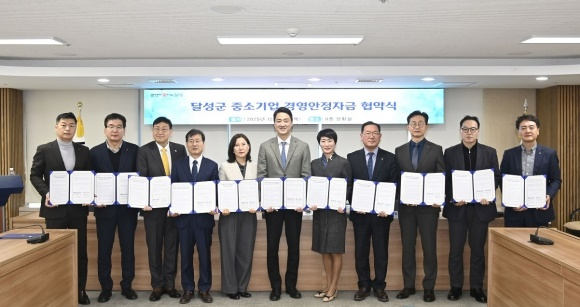 달성군이 지난 19일 대구신용보증재단 및 금융기관 13개사와 관내 중소기업의 금융 지원 강화 및 지역 경제 활성화를 위해 중소기업 경영안정자금 지원사업 업무협약을 체결했다.
