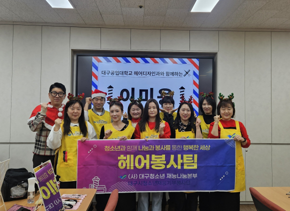 | ↑↑ 대구공업대학교 헤어디자인과 학생들이 달서구노인종합복지관에서 '남자는 머리빨' 이미용 봉사활동을 한 뒤 기념촬영을 하고 있다. 대구공업대 제공 |
