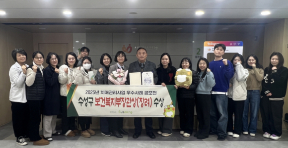 대구 수성구 치매안심센터가 보건복지부와 중앙치매센터가 공동 주최한 ‘2025년 치매관리사업 우수사례 공모전’에서 ‘치매환자 및 보호자 지원’ 분야 보건복지부장관상을 수상했다