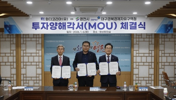 대구경북경제자유구역청(청장 직무대행 강상기, 이하 DGFEZ)이 지난 6일 영천시청에서 강상기 대구경북경제자유구역청장 직무대행과 최기문 영천시장, 왕밍 화더코리아(유) 대표이사 등이 참석한 가운데, 화더코리아(유)의 자동차 부품 사업을 성공적으로 추진하기 위한 투자양해각서(MOU)를 체결했다.