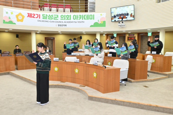 | ↑↑ 제2기 아카데미에 참여한 학생들이 달성군의회 본회의장에서 ‘제2기 청소년 의회 아카데미’ 개회식에서 선서하고 있다. 달성군 제공 |
