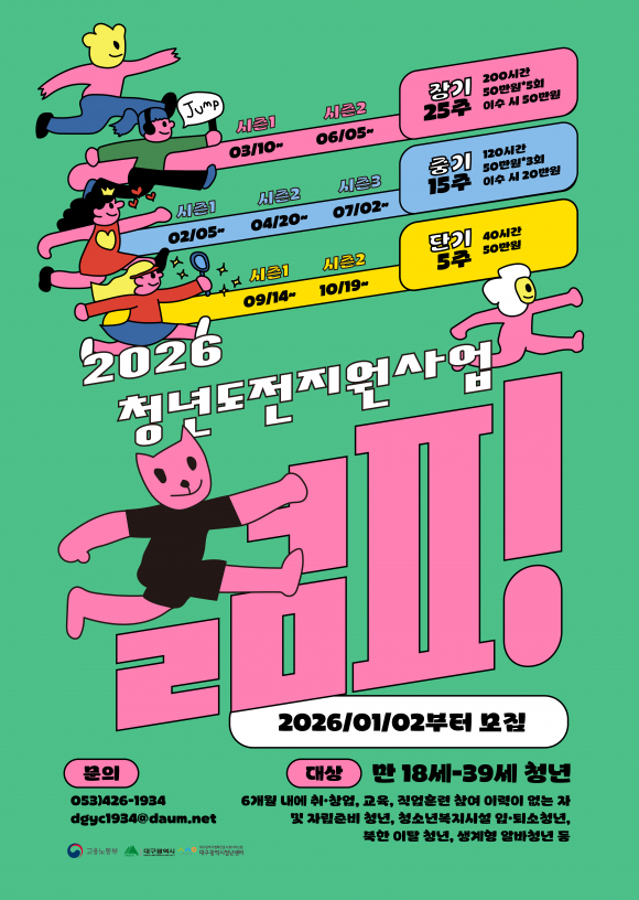박윤희 대구시 청년여성교육국장은 “청년도전지원사업은 취업 과정에서 잠시 멈춰 선 청년이 다시 자신감을 찾고 재도전에 나설 수 있도록 돕는 맞춤형 지원 정책”이라며 “지역 청년들의 많은 관심과 참여를 부탁드린다”고 말했다.
