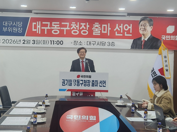 대구 권기일 전 시의원(국힘 대구시당 부위원장)이 3일 오전 국힘 대구시당에서 기자회견을 열고 "동구의 미래를 앞당기겠다"며, 오는 6·3 지방선거 동구청장 출마를 선언했다.