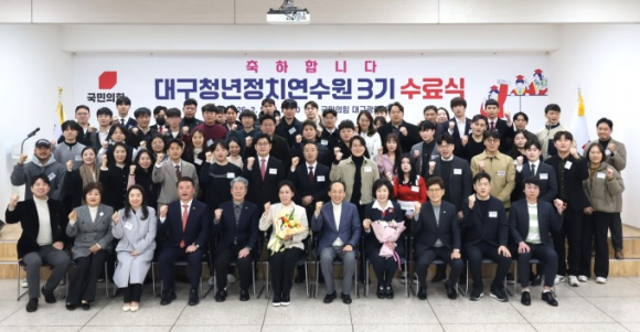 국힘 대구시당이 지난 5일 오후 시당 5층 강당에서 대구청년정치연수원 3기 수료식을 개최했다. 수료식은 지역 청년 정치 인재 양성과 정치 참여 확대를 위해 운영된 연수과정을 마무리하는 자리로 마련됐다.