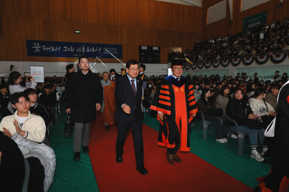 | ↑↑ 주낙영 경주시장이 20일 동국대학교 WISE캠퍼스 문무관에서 열린 ‘2026학년도 입학식’에 참석해 내빈들과 함께 입장하고 있다.<경주시 제공> |