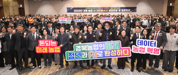 경북 농업기술원이 기후 위기와 고령화로 인한 현재 농업의 한계를 극복하고 인공지능(AI)과 첨단 로봇 기술을 접목한 농업대전환의 계기를 마련하기 위해 25일 안동 스탠포드호텔에서‘2026년 경북농업 인공지능 대전환(AX) 비전 선포 및 심포지엄’을 개최했다.