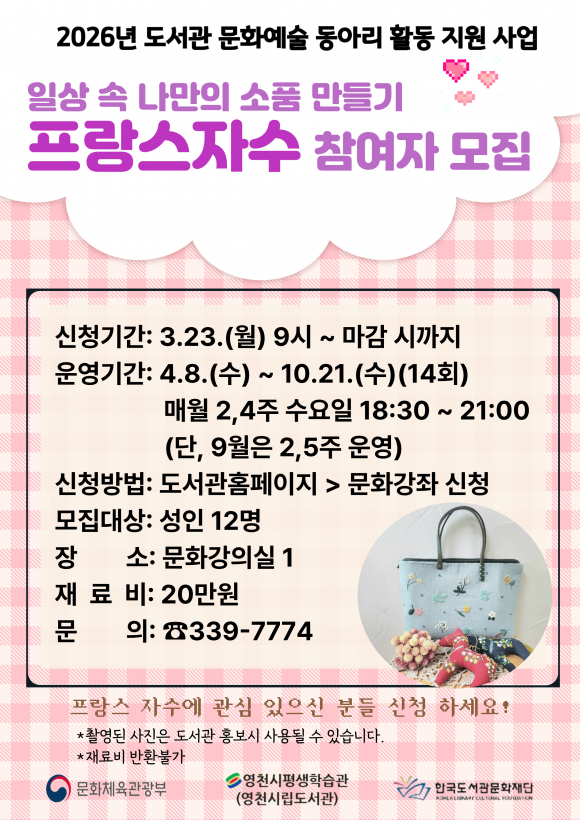 프랑스 자수 동아리는 올 4월~10월까지 운영되며, 23일부터 시립도서관 홈페이지에서 참여 신청을 받는다. 참여자들은 ‘일상에서 사용하는 나만의 소품 만들기’를 주제로 프랑스 자수 기법을 배워 클러치, 키링, 인형 등 다양한 작품을 만들고, 11월에는 7개월간 결과물을 공유하는 전시도 선보일 계획이다.