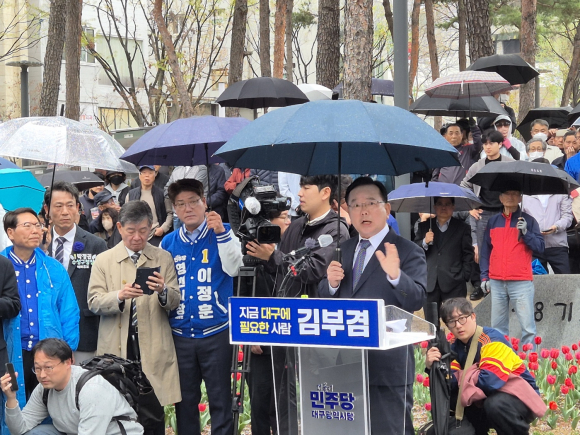 | ↑↑ 김부겸 전 총리가 비가 오는 가운데 2·28기념중앙공원에서 대구 시장 출마를 천명하고 있다.<황보문옥 기자> |