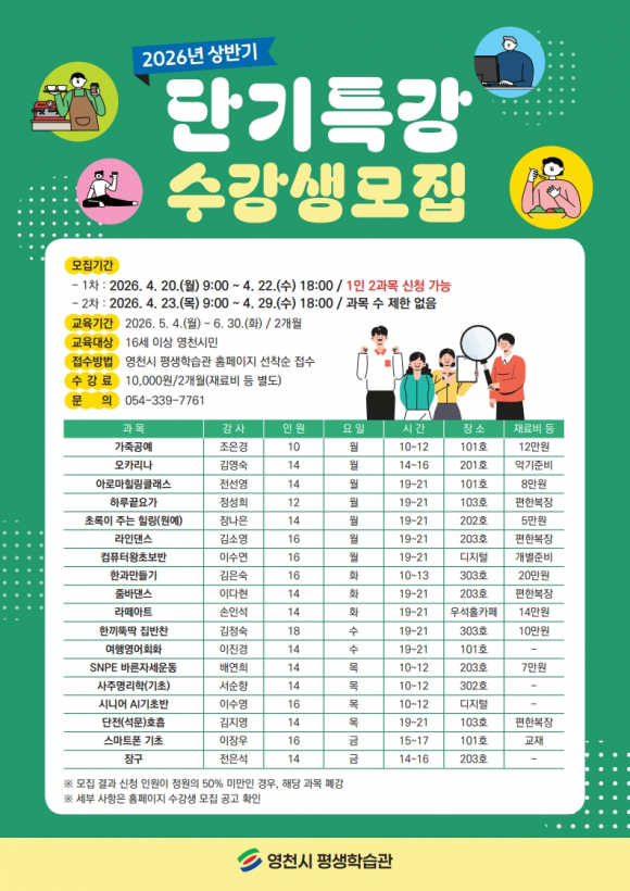 영천 평생학습관이 시민의 자기 계발과 여가 활동을 지원하기 위한 ‘2026년 상반기 단기특강’ 수강생을 20일부터 선착순 모집한다.