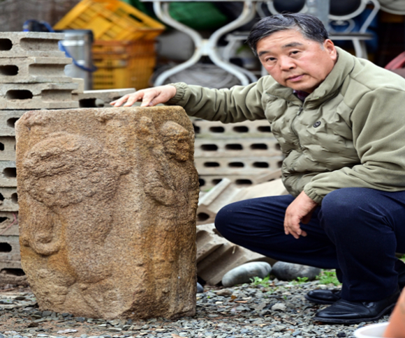 십 수년간 신라왕릉 석각을 연구해 온 이진락 경주시의원이 1920년대 사라진 것으로 알려진 경주 구정동방형분 모서리돌을 발견했다.