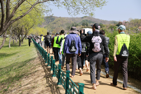 행사에는 시민과 관광객 등 약 800명이 참여해 진평왕릉에서 명활산성까지 이어지는 왕복 4.4㎞ 구간을 맨발로 걸으며 봄 정취를 만끽하고 몸과 마음을 돌보는 시간을 가졌다.