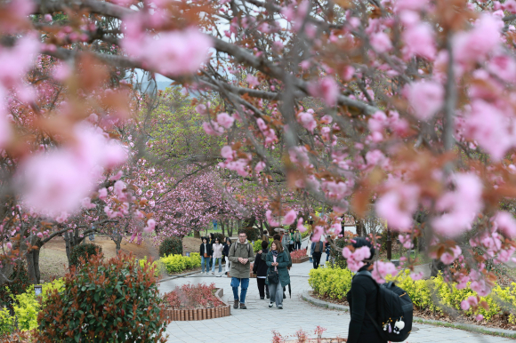 | ↑↑ 지난 14일 겹벚꽃이 만개를 앞둔 경주 불국사공원 산책로에서 관광객들이 분홍빛 꽃길을 걸으며 봄 정취를 즐기고 있다.<경주시 제공> |