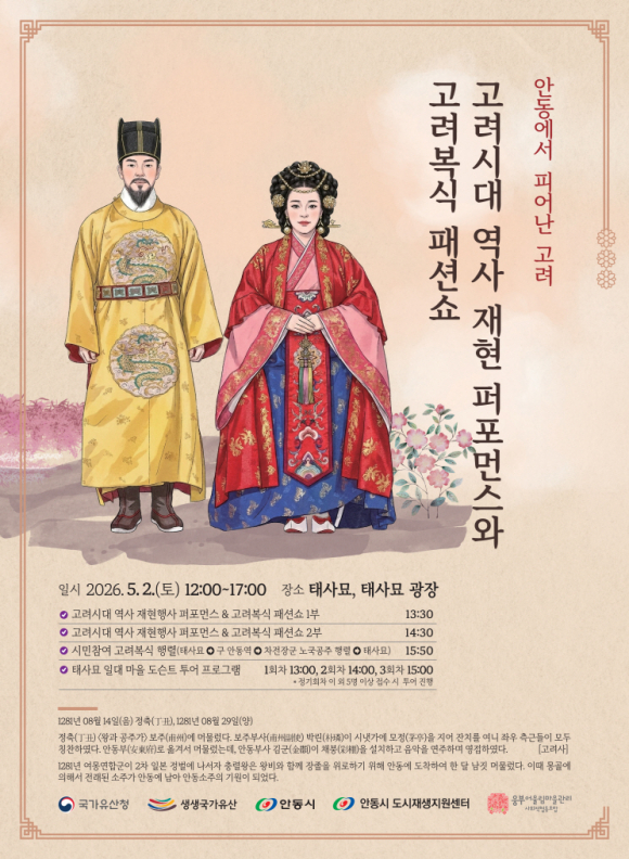 안동 도시재생지원센터가 오는 5월 2일 정오부터 태사묘와 태사광장 일대에서 ‘2026년 생생 국가유산 사업’의 일환으로 진행되는 ‘안동에서 피어난 고려’행사를 개최한다.