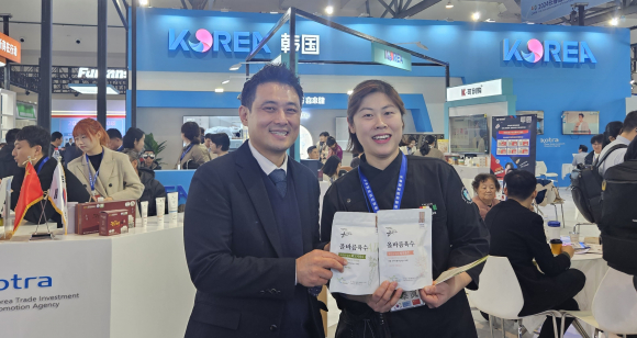 | ↑↑ 이태진 큰기와집 대표가 코트라 행사에서 올바름 육수를 홍보하고, 기념촬영을 하고 있다.<영천시 제공> |