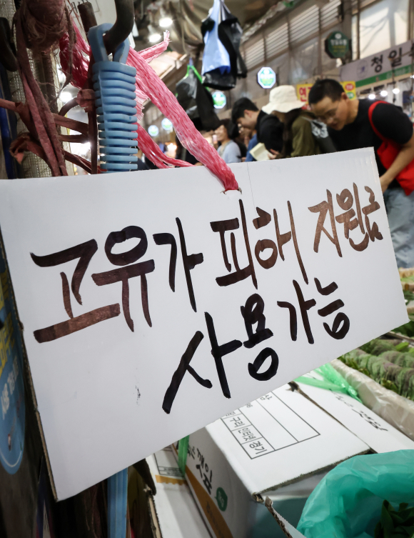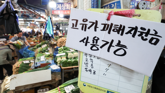 고유가 피해지원금 1차 지급 신청일인 27일 서울 동대문구 경동시장 한 점포에 ’고유가 피해지원금 사용 가능‘안내문이 게시돼 있다. 피해지원금 대상은 소득 하위 70%국민에게 1인당 10만~60만 원을 차등 지원하며 1차 지급 대상자는 기초생활수급자, 차상위계층·한부모가족 등 취약계층이다. 신청 첫 주에는 혼잡 및 시스템 과부하를 막기 위해 출생 연도 끝자리를 기준으로 요일제가 적용되며 오는 5월 8일 오후 6시까지 온오프라인으로 신청할 수 있다.뉴스1