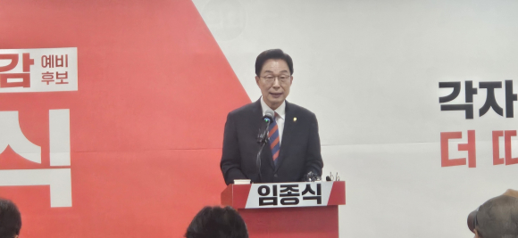 | ↑↑ 임종식 교육감이 출마 기자회견을 하고 있다.<김구동 기자> |