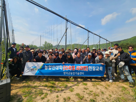 영덕군이 관내 사과 재배 농가의 기술 역량과 전문성을 강화하기 위해 운영하는 ‘2026년 농업인 대학 다축형 사과반’의 현장 교육을 지난 28일 진행했다.